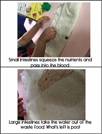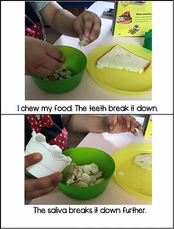 Step 1: I gave my little one some bread and she broke it into pieces. We discussed that our teeth does the same thing. Then she added some water(saliva) to help the food go down the food pipe.