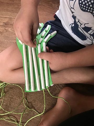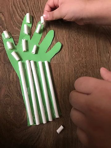 Outline your child's hand on the card stock and cut it out. Cut the straw into three segments for each finger. Tape them down without covering the ends. Tape the yarn to the back of the hand and then thread it through each finger segment down to the wrist. Now, you can move the yarn to see how the hand moves!